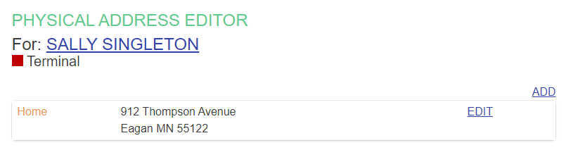When you click on ADD, the physical address form will appear. (If you click on EDIT, it will also appear with the physical address data to be edited populated on the form.)