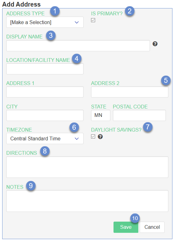 - Enter a DISPLAY NAME for the address. This will appear on several pages. Usually this is something like "HOME" or "REHAB FACILITY".