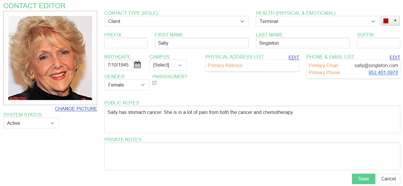 Click on the EDIT link for the contact. The Contact Editor page will appear.