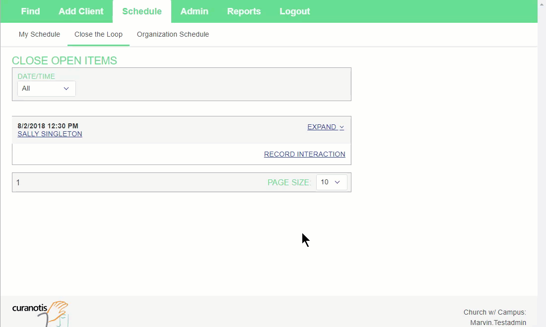To quickly record an interaction for an appointment assigned to you, you can use the Close the Loop page. To access this page, click on the Schedule tab. Then click on Close the Loop.