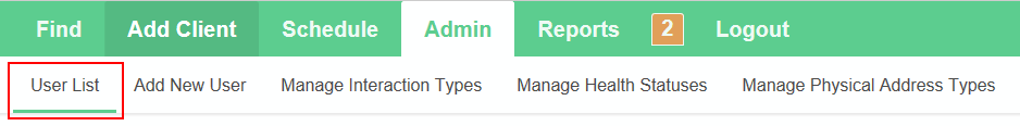 To see the current list of users for your organization, click on Admin. (If you are already on the Admin menu, you may also need to click on User List.)
