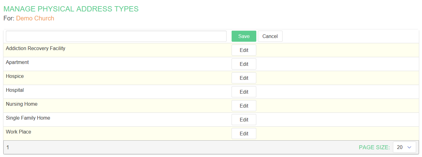 To add a new physical address type, enter the physical address type name in the textbox above the list and click on Save. To change an existing physical address type, click on Edit for the item, then make your changes and click on Save.