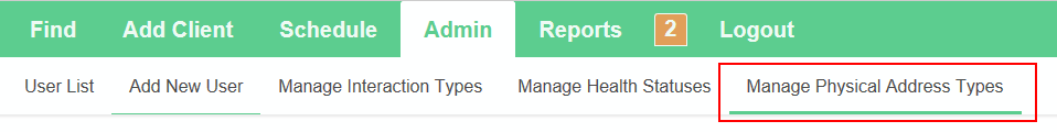 To manage physical address types, click the Admin menu, and then select Manage Physical Address Types.
