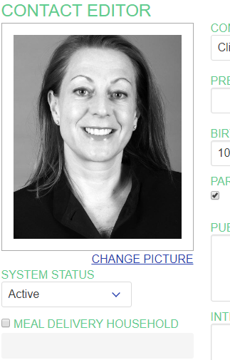 Next, let's look at how the contact editor shows the custom fields. In the Contact Editor, custom fields appear below the photo and system status. For example, here's how it looks for a client with our new custom field:
