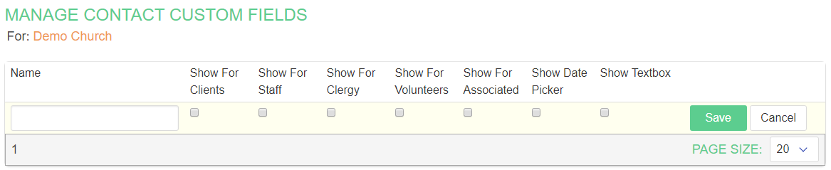 Notice that if desired, a custom field can appear for multiple types of contacts. Also, a custom field can show both a date picker and a textbox, or show neither making the custom field a single true/false type. (This might be useful if you wanted to capture something simple like if a volunteer can provide rides to clients.