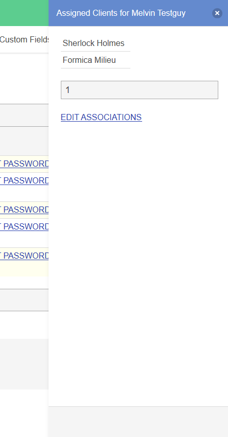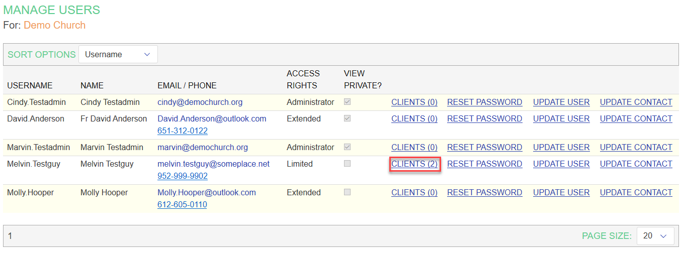 - Find the user to be granted rights, and click on CLIENTS for that user. The list of current clients associated with this user appears in a panel along the right.