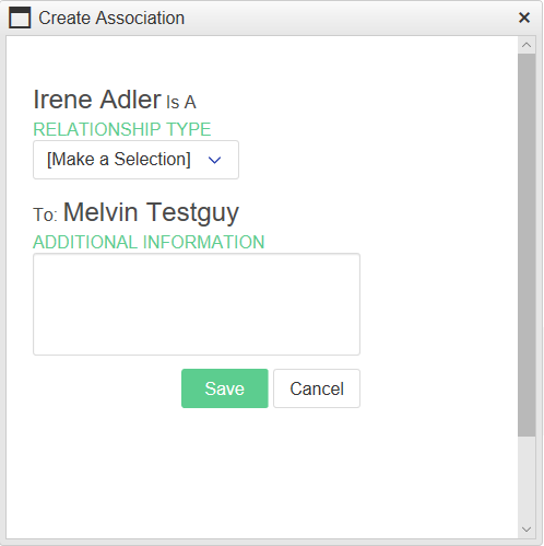 - Use the Select Contact to Associate section to find each client you want this user to be able to view. Enter the client's name in the first / last name fields, and click on Search. When you have found the client, click on the Associate button. The Create Association form appears: