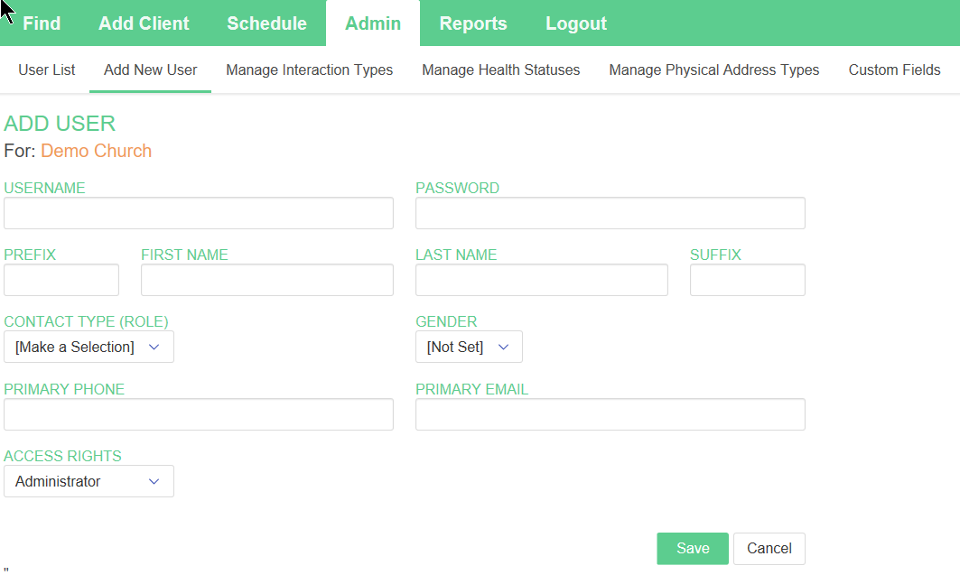 - Limited: These users have very limited access. Typically users with these access rights are volunteers who visit pastoral care clients.