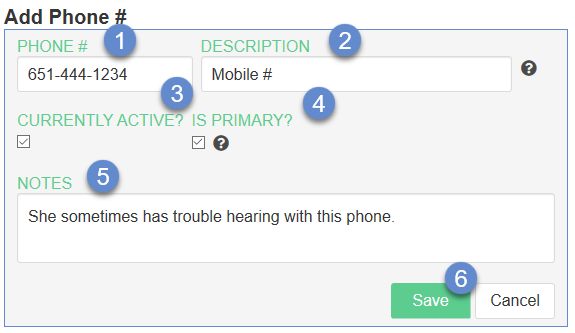 - Check the checkbox if this phone number is CURRENTLY ACTIVE? Some phone numbers may be temporarily or permanently inactive if the contact moves to a facility. Inactive numbers do not appear on the Client Overview page.