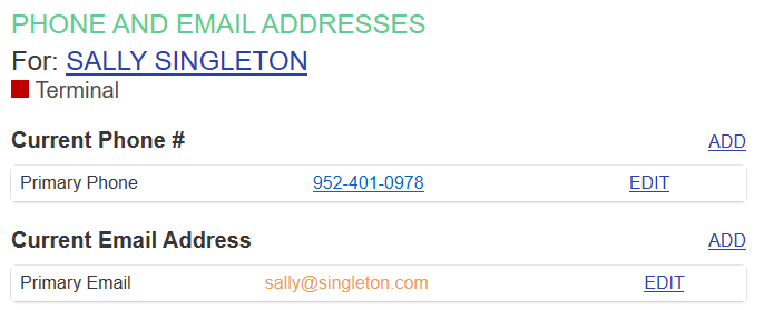 But if the client has an additional phone number or email address, you may prefer to use ADD to create a new phone or email address. In this way, if a client moves between a nursing home for rehabilitation and their home, for example, both phone numbers will be available, and you can easily switch the primary phone number when they return home. This also allows you to capture both a home number and a mobile number, if desired.
