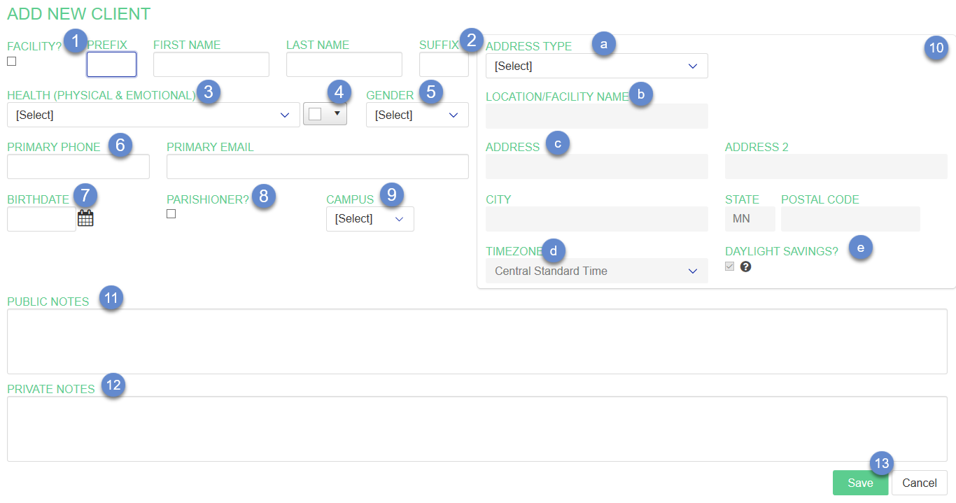 - Enter the client's name. FIRST NAME and LAST NAME are required, PREFIX (such as "Dr." or "Fr.") and SUFFIX (such as "III" or "Jr.") are optional. (If this is a facility, it show show FACILITY NAME instead.)