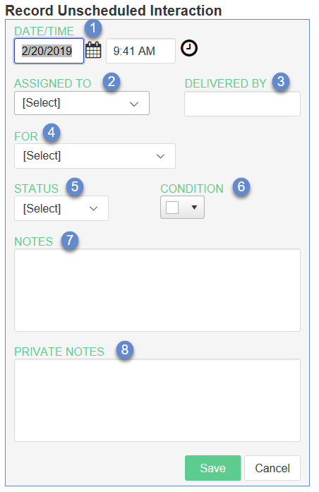 - Enter the DATE/TIME that the interaction took place. You can click or tap on the calendar icon to use the popup date picker, and click or tap on the clock icon to use the time picker. If you don't recall the exact time, use your best guess. (Required)