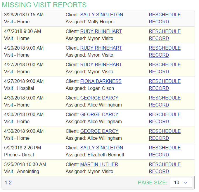 - For visits that did not happen and should be rescheduled, use the RESCHEDULE link to update the scheduled date to a new date in the future. This will remove the item from the report.