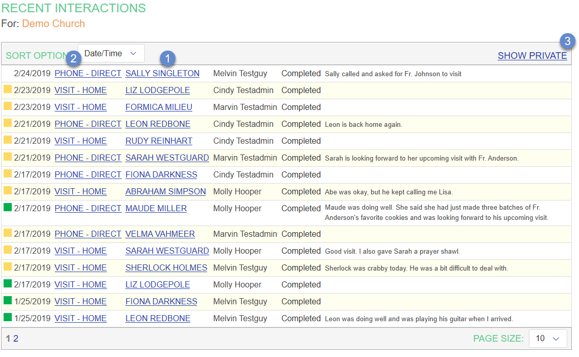 Curanotis administrators and clergy may find it useful to periodically review recent interactions that have been logged in Curanotis. the Recent Interactions report shows all interactions across the organization sorted in reverse date order.