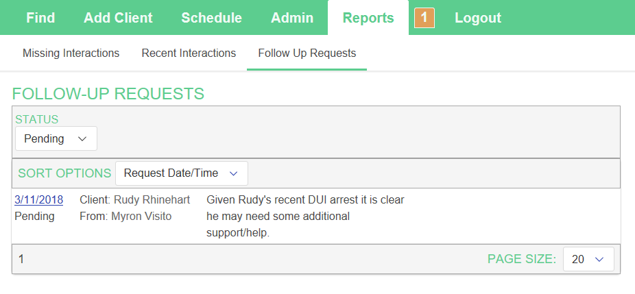 Pending Follow-Up Requests can be viewed on the Follow-Up Requests report. To access this report, click on Reports, and then Follow-Up Requests.