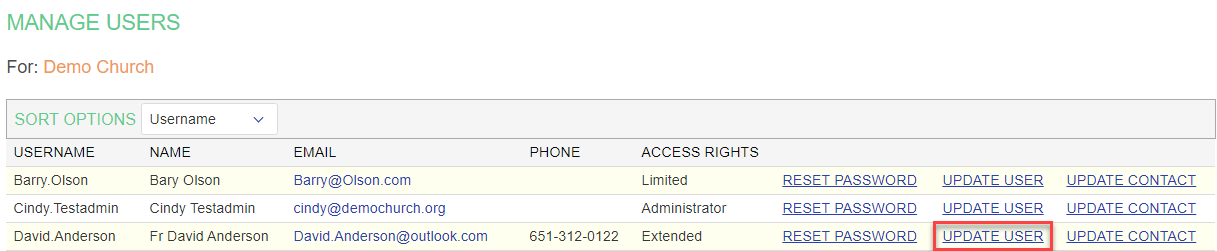 By default, only users with Administrator or Extended access rights can schedule interactions. However, administrators have the option of granting users with Limited access rights permission to add or edit their own schedule interactions. From the Admin menu, the Curanotis Admin will click on the UPDATE USER link on the MANAGE USERS page for the Visitor they want to grant privileges to (see below).