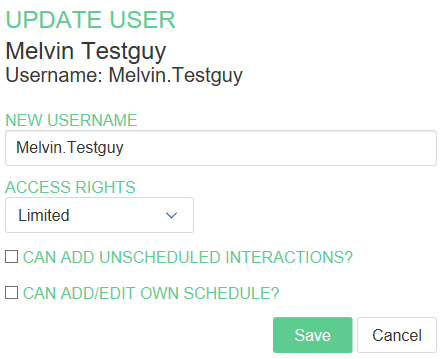 On the UPDATE USER page, select the checkboxes associated with allowing visitors to add unscheduled interactions and/or editing their schedule (see below) and click SAVE.