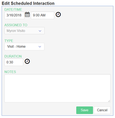 If they click on the Edit button they will be allowed to make a subset of adjustments to the scheduled interactions (see below):