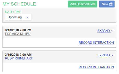 When the volunteer logs into Curanotis, if they have been granted the rights to add unscheduled interactions or edit their schedule they will see two buttons at the top of the MY SCHEDULE PAGE to allow them to do this (see below).